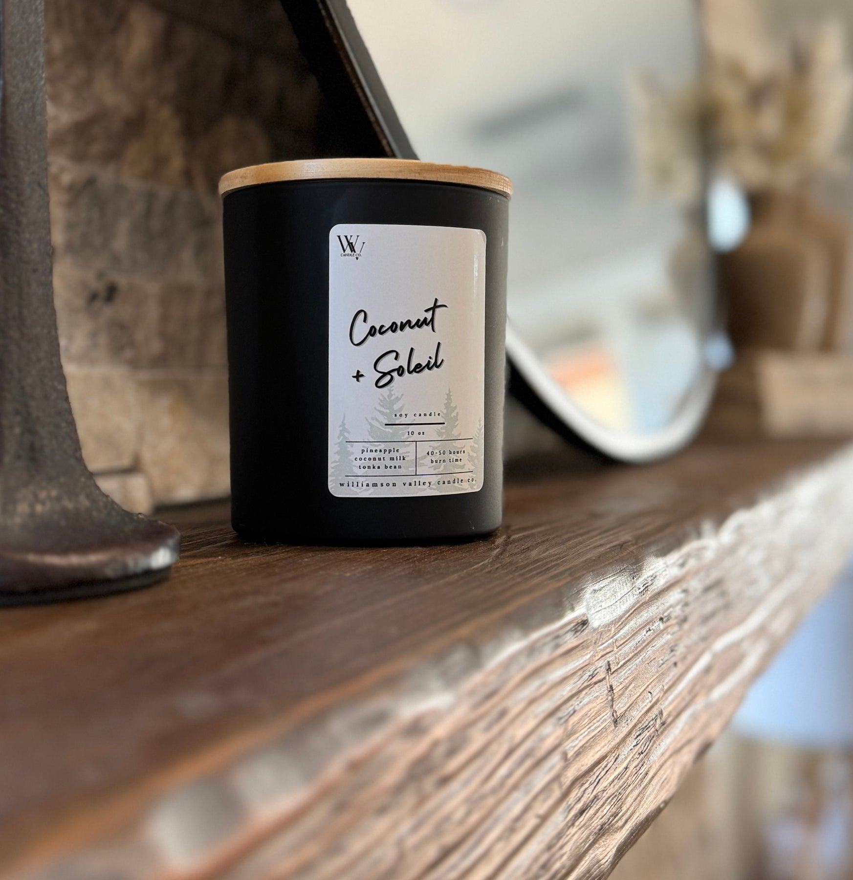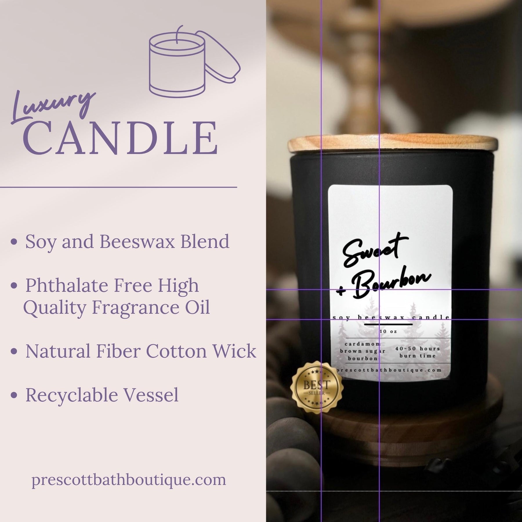 Each 10 oz candle is hand-poured in small batches at Prescott Bath Boutique. We use a natural blend of soy wax and beeswax from Arizona beekeepers in Yavapai County, creating a cleaner burn and a lasting glow. The matte black jar with bamboo lid brings modern elegance, while the double wicks provide an even melt and steady flame that fills your space with fragrance.