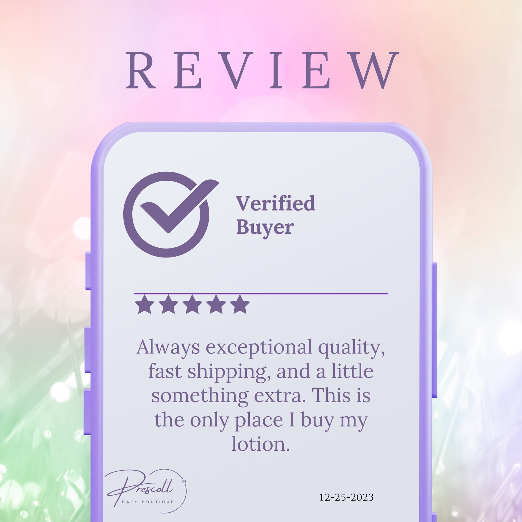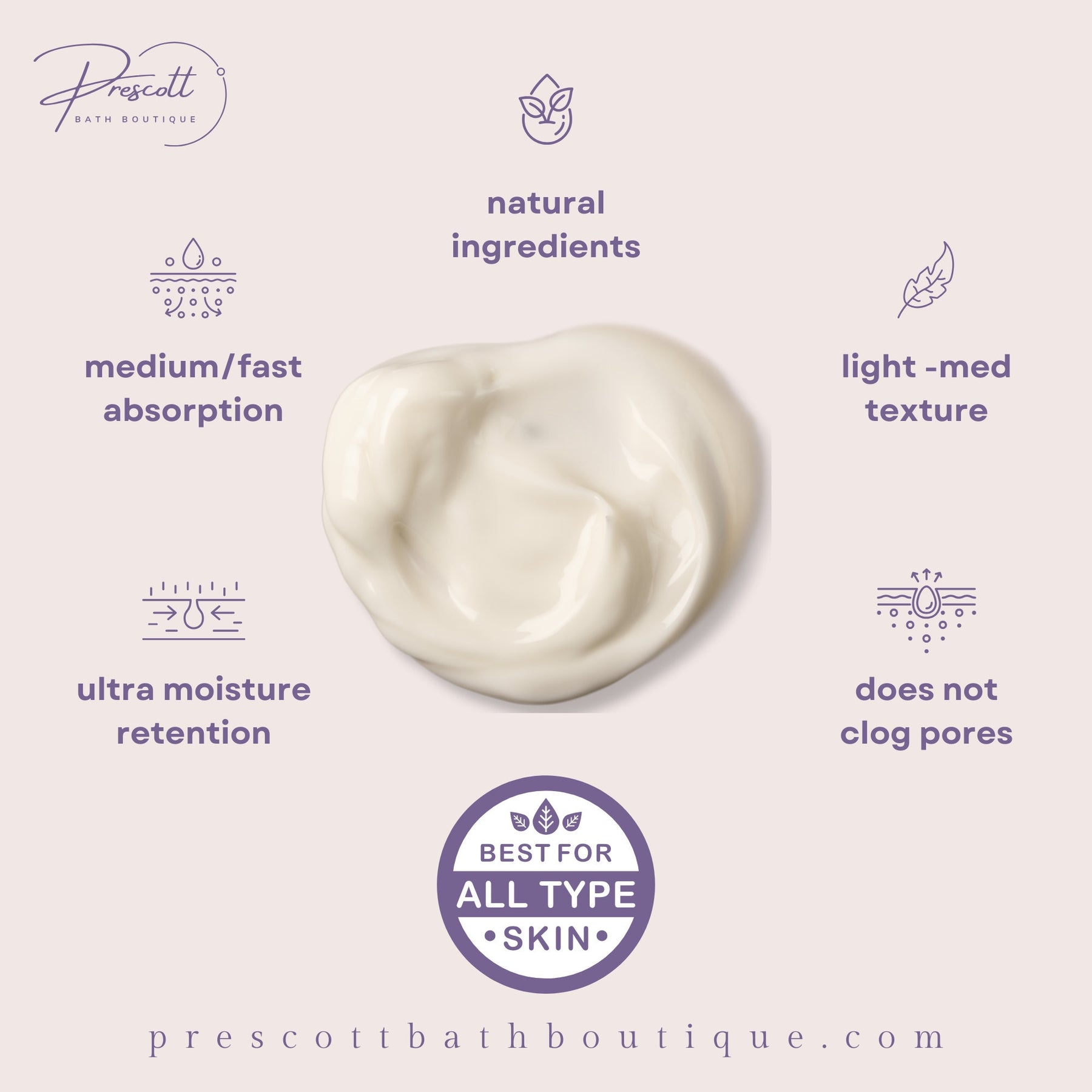 A luxurious lotion made with skin-loving ingredients including shea butter, apricot oil, colloidal oatmeal, honeyquat, and premium fragrance oils. It absorbs quickly, leaving skin soft, supple, and comfortable all day. Our lotion is suitable for all skin types and is part of Prescott Bath Boutique, where handmade meets luxury.