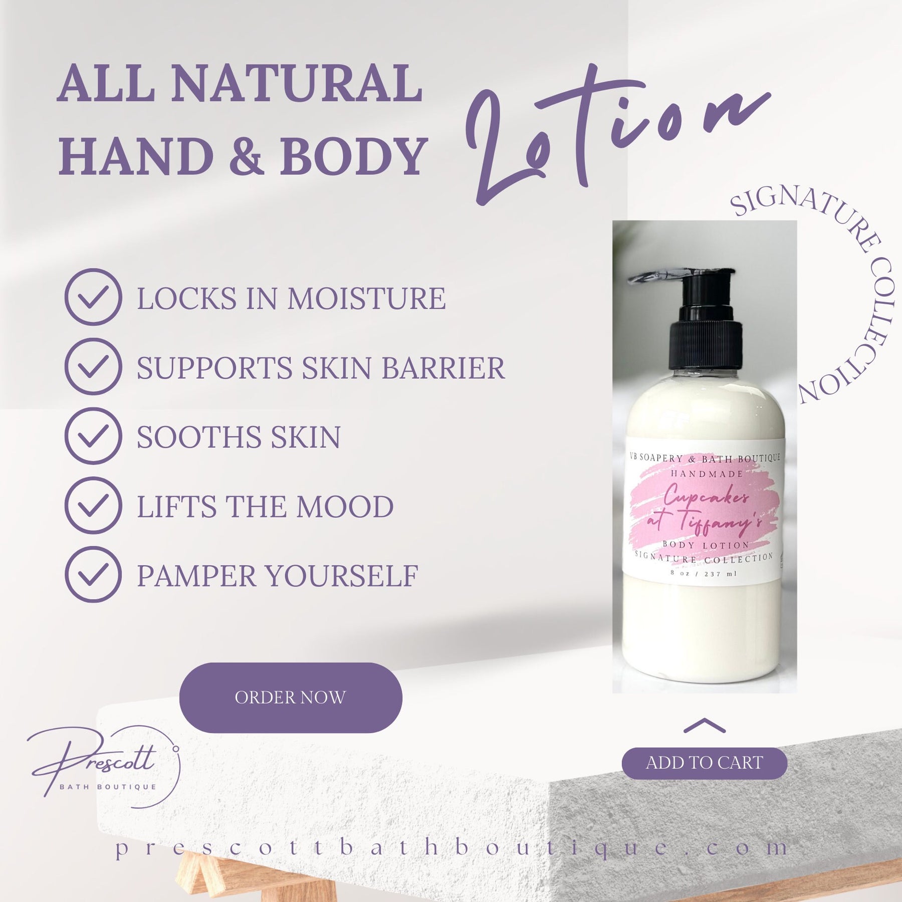 A luxurious lotion made with skin-loving ingredients including shea butter, apricot oil, colloidal oatmeal, honeyquat, and premium fragrance oils. It absorbs quickly, leaving skin soft, supple, and comfortable all day. Our lotion is suitable for all skin types and is part of Prescott Bath Boutique, where handmade meets luxury.