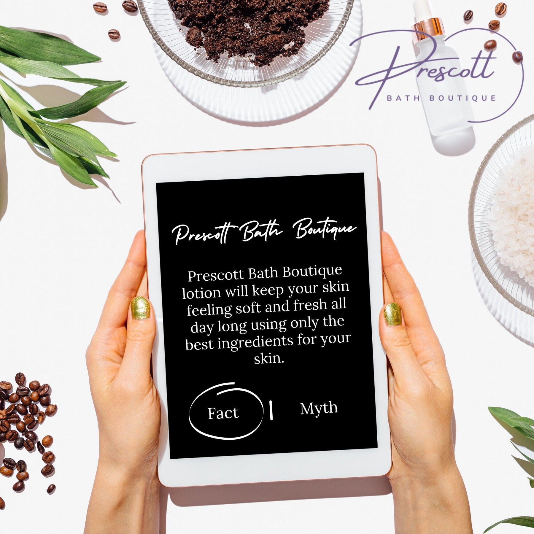 A luxurious lotion made with skin-loving ingredients including shea butter, apricot oil, colloidal oatmeal, honeyquat, and premium fragrance oils. It absorbs quickly, leaving skin soft, supple, and comfortable all day. Our lotion is suitable for all skin types and is part of Prescott Bath Boutique, where handmade meets luxury.